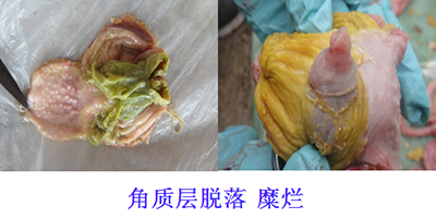 谷鳳柱教授還說(shuō),肌胃炎多和腺胃炎同時(shí)發(fā)生,但也可單獨(dú)發(fā)生,且對(duì)雞的危害大于腺胃炎。由于病因不同,臨床肌胃角質(zhì)層的病理變化也不盡相同。臨床上經(jīng)??吹郊∥附琴|(zhì)層的糜爛、崩解一定是發(fā)生了肌胃炎,但角質(zhì)層沒有糜爛不一定不是肌胃炎,要認(rèn)真辯證分析。如果發(fā)現(xiàn)角質(zhì)層已經(jīng)發(fā)生褪色、變淡,那么我們就應(yīng)該注意了。